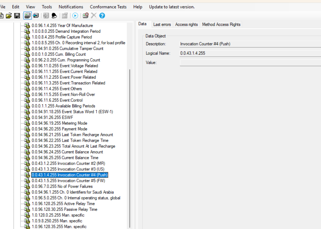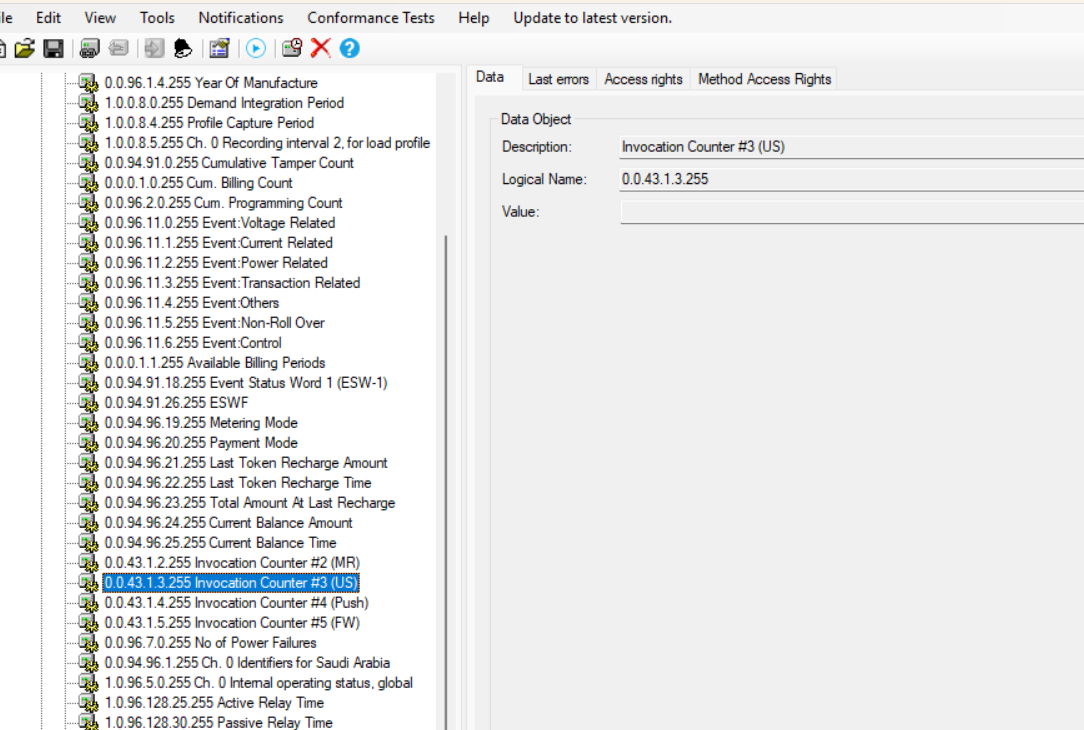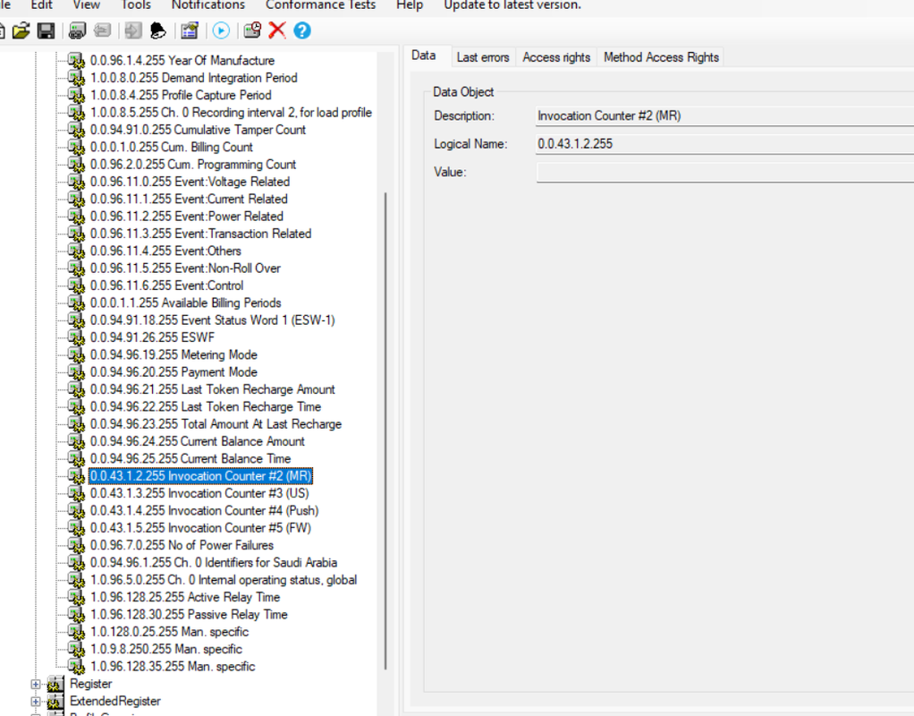 3) To test further, I used the same Invocation Counter (0.0.43.1.3.255) that I obtained