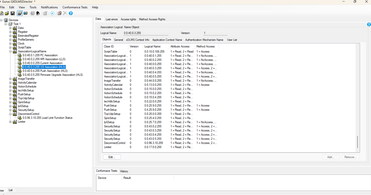 Today, I was able to make small changes in the code and successfully download the association. However, I still cannot see the Disconnect Control enabled. Could you please clarify what is required to enable it? In our handshake, we sent the security request with Get/Set conformances, but the meter is only replying with Get. What steps are needed to perform actions like setting the clock or disconnect control on the meter using the probe? I am also providing a video of my testing for reference: